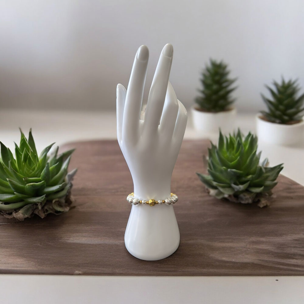 Elevate your accessory collection with this striking bracelet, featuring a blend of hematite, metal, and volcanic hematite beads. The sleek hematite and metal elements provide a modern, metallic sheen, while the volcanic hematite beads add a unique, earthy texture. Perfect for any occasion, this bracelet is designed to complement both casual and formal outfits, making it a versatile addition to your jewelry box.